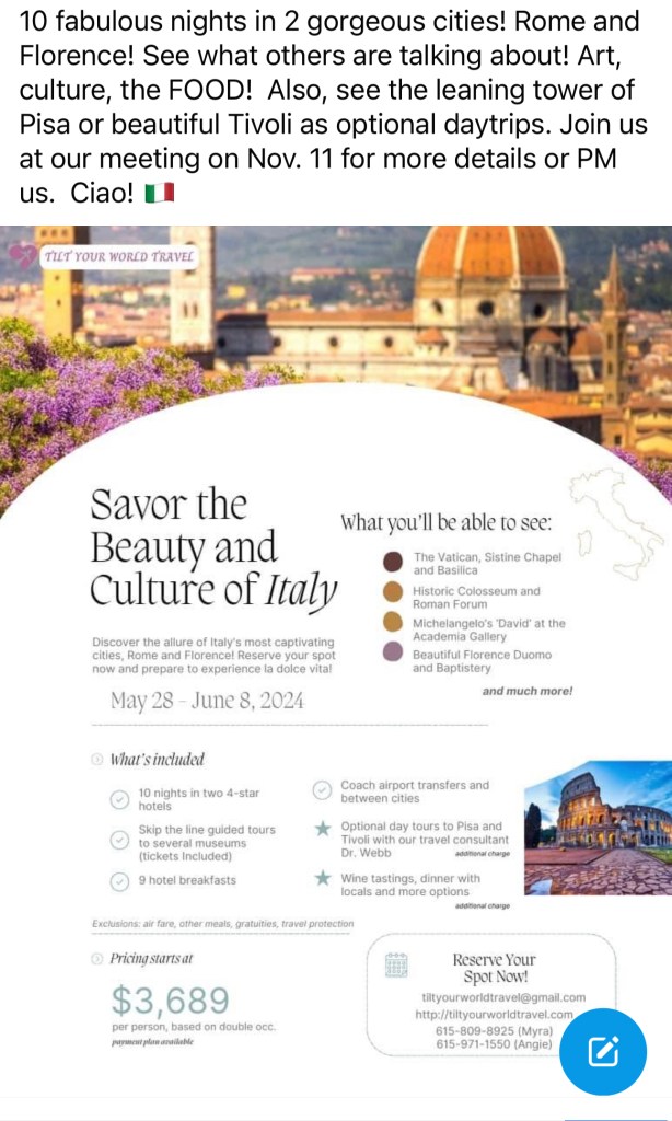 For our first group experience, we are going to Italy and you are invited! Currently, we are planning for late May, early June 2024.