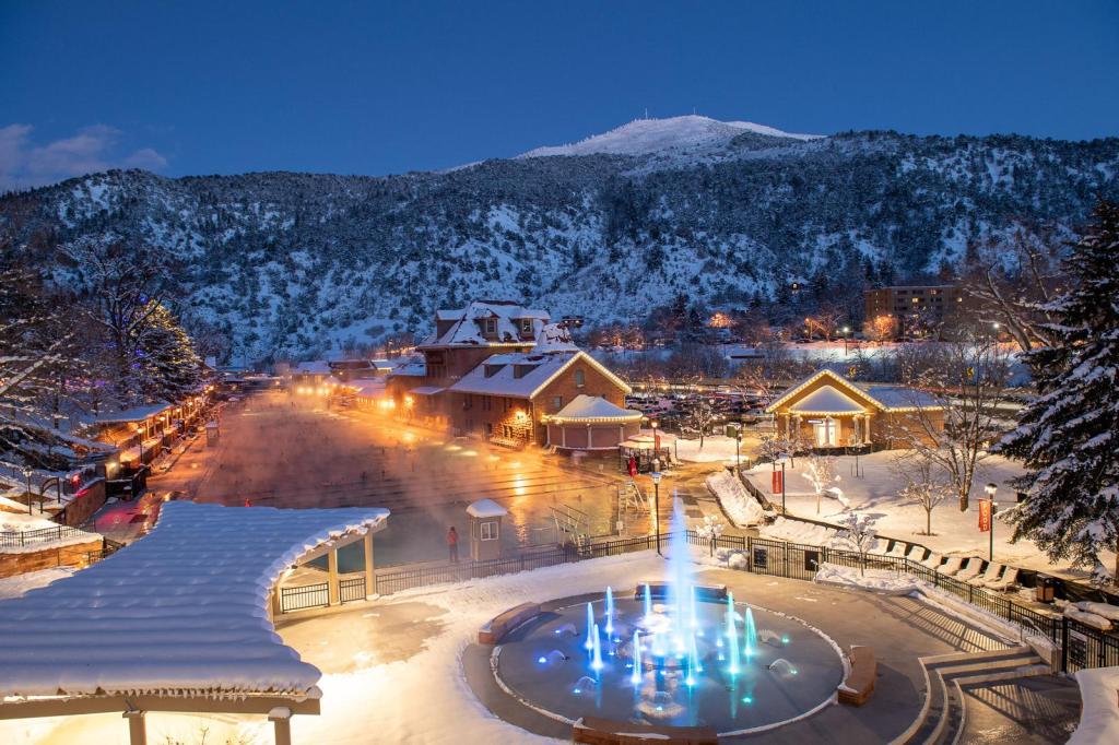 Pics: Glenwood Springs- since 1888. Huge natural hot springs pool with fog rising and snowy mountains in Glenwood Springs, Colorado. Icon of the Seas cruise Ship.